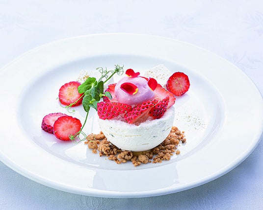 レモングラスのグラニテをメインとした爽やかなデザートに仕上げました。ミントグラッセの器にカスタードクリーム、苺のソース、下に敷き詰めたクランブルとの食感をお楽しみください。山椒風味のパンナコッタも口に含んだ時のふわっとした香りが広がります。
