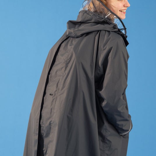 リュックの上からでも羽織れるワイドサイズながら、軽量&ストレッチ性がある生地で動きやすい。
