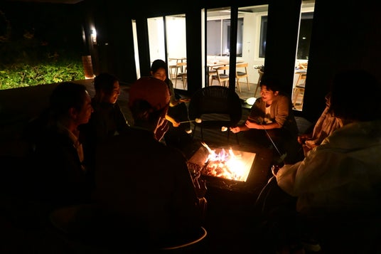 焚き火を囲んだアウトドアミーティングが、チーム内の対話を促進。