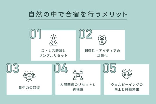 - ウェルビーイングの向上と持続効果 自然の中での合宿は、心身の健康だけでなく、「前向きな気持ち」や「感情の安定」にもつながり、帰社後のモチベーション維持にも効果的です。
