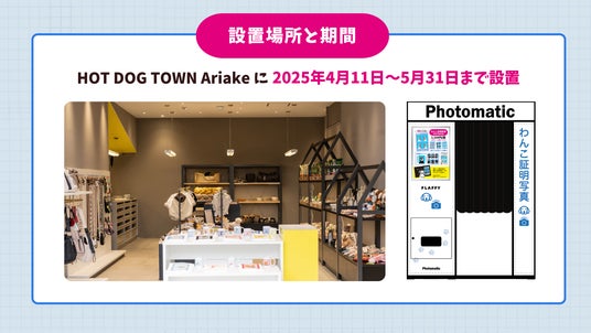今回は東京・有明にある「HOT DOG TOWN Ariake」にて設置します。当施設は愛犬用グッズが並ぶセレクトショップ、愛犬とのオンリーワンアイテムをその場で製作・お持ち帰りできる工房、トリミングサロン、室内ドッグラン、ドッグカフェが常設された、愛犬とのワクワクが集まった複合施設です。わんこ証明写真の撮影後は、画像データを使ったうちの子グッズも制作可能です。