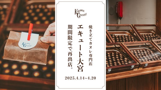東京・蔵前にあるSNSで話題の焼き立てカヌレ専門店「KURAMAE CANNELE(クラマエカヌレ)」(運営:CLASSIC INC.、代表取締役 : 萱場俊克、本社 : 東京都渋谷区)は、2025年4月14日(月)~4月20日(日)にエキュート大宮にて催事を実施いたします。蔵前の工房で焼き上げた「クラマエ・カヌレ」をその日のうちにお届けし、販売いたします。1日で3,000個販売したこともある人気商品「クラマエ・カヌレ」。お近くの方はぜひお立ち寄りください。