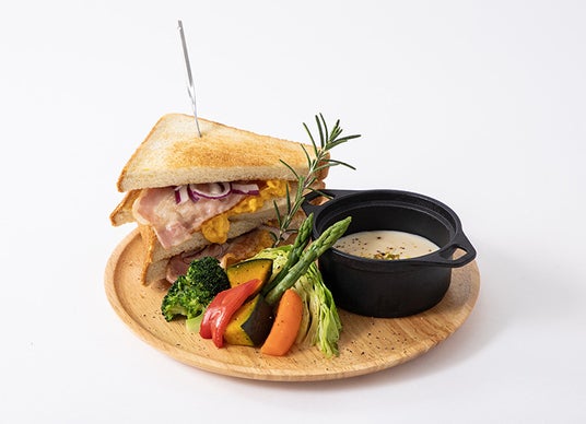 スクランブルエッグとベーコンを挟んだホットサンドプレート。