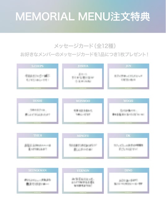 CAFEでMEMORIAL MENUをご注文された方にご希望のメンバーの「メッセージカード(全12種)」を1品につき1枚プレゼント。