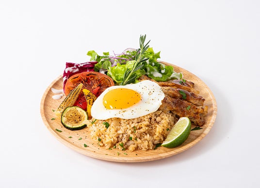目玉焼きをのせたナシゴレンとバーベキューチキンのプレート。