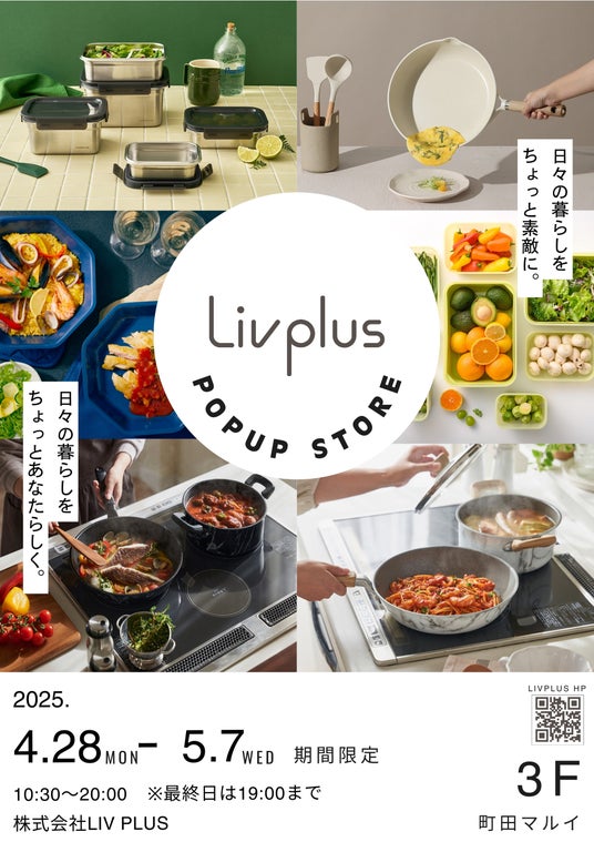 「日々の暮らしをちょっと素敵に。日々の暮らしをちょっとあなたらしく。」をコンセプトにキッチン・レジャー用品などを開発する、株式会社LIV PLUS(本社:大阪府、代表取締役社長:中西大輔)は、2025年4月28日(月)~5月7日(水)の10日間、町田マルイ3Fにポップアップストアを初出店します。人気のフライパンをはじめとしたキッチン雑貨・高機能保存容器やタンブラー・保冷バッグなどのダイニング・レジャー用品を販売いたします。