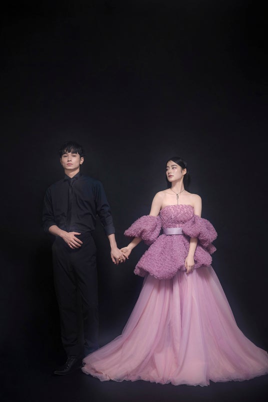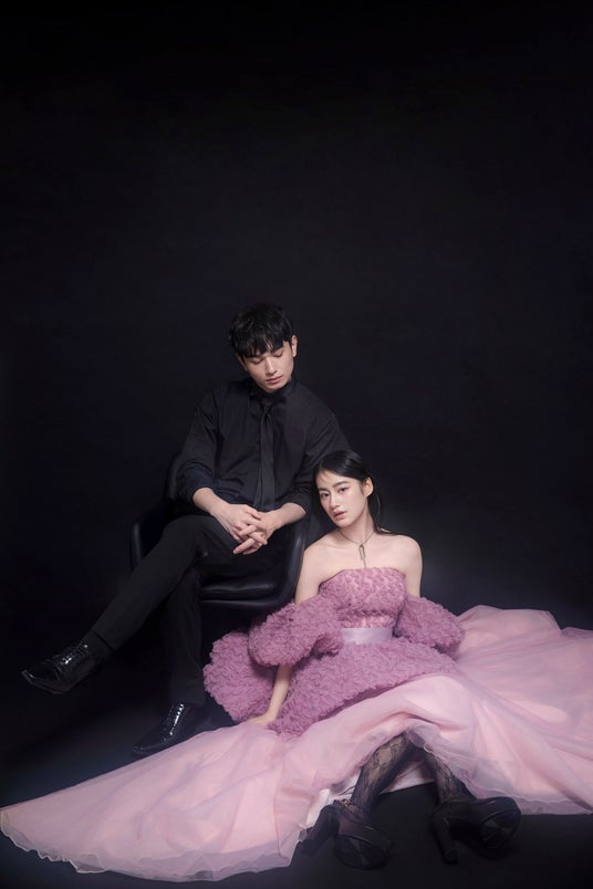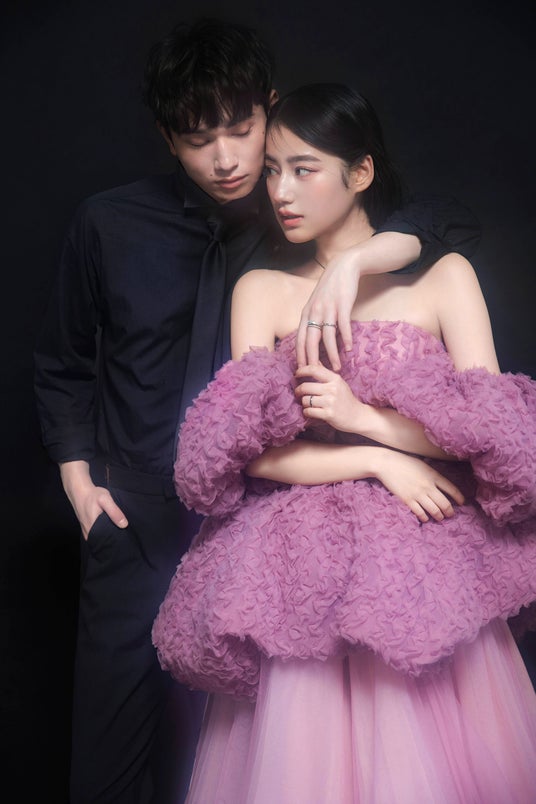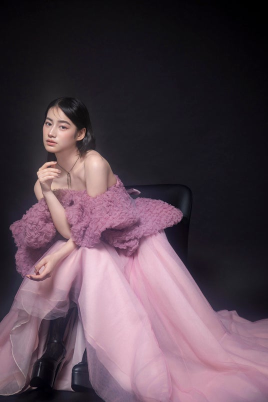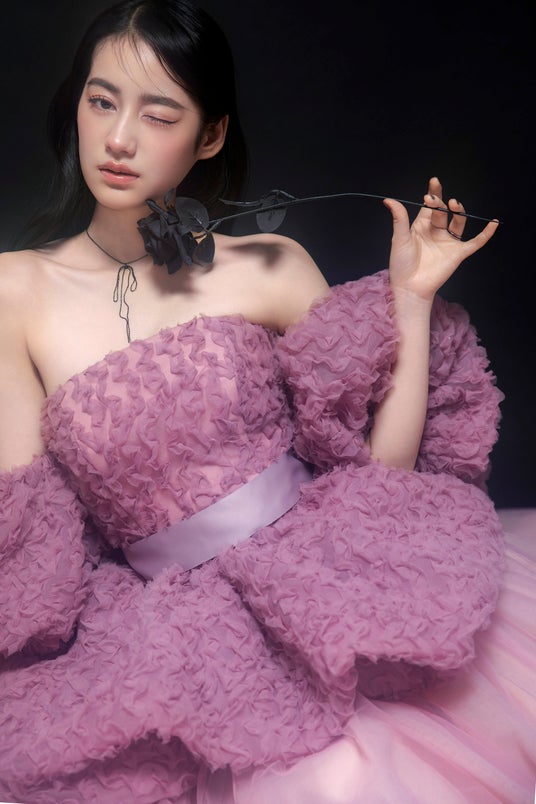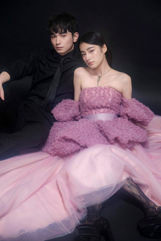 ブラックペーパーの背景にピンクとブラックの衣装を合わせ、バレエコアな雰囲気の中にスパイシーさを感じる斬新なスタイリング。着用ドレスは今SNSで大流行中の『ISAMU MORITA』のドレス。トイプードルのようなモコモコとしたシルエットのペプラムがインパクト大のロマンティックドレス。