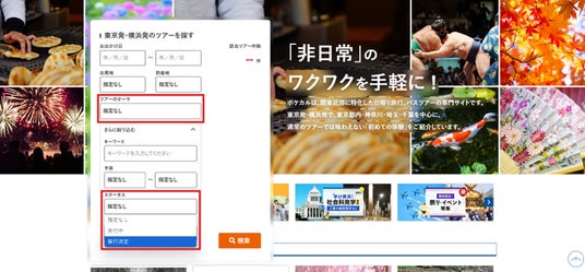 これまでの「おでかけ日」「予算」「出発地」「到着地」などの項目に加え、「ツアーのテーマ」「ステータス」も掛け合わせて検索ができるようになり、ツアー探しがより便利になりました。