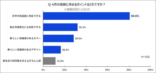 4月の服装に求めるポイントとしては、「日中の気温差に対応できる」が80.6%、続いて「急な天候変化にも対応できる」が32.1%という結果で、一日の中でも気温・天候の変化に対応する柔軟な服装が求められています。