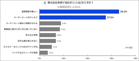 服装選びで悩むポイントとして、「温度調節が難しい」が33.1%と最も高く、多くの方が天候や気温変動に対応できる服装を求めていることがわかりました。一方で、「コーディネートのマンネリ」が27.5%という結果から、アウター1枚で印象が変わるこの時期に対しての悩みが見受けられました。