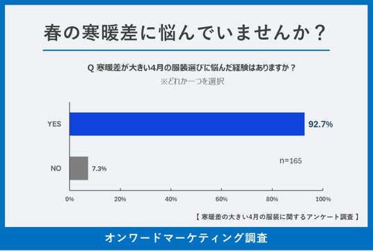 調査結果によると、「寒暖差が大きい4月の服装選びに悩んだ経験がある」と回答した人が92.7%と、多くの人が寒暖差の大きい4月の服装選びに悩んだ経験があると感じていることがわかりました。