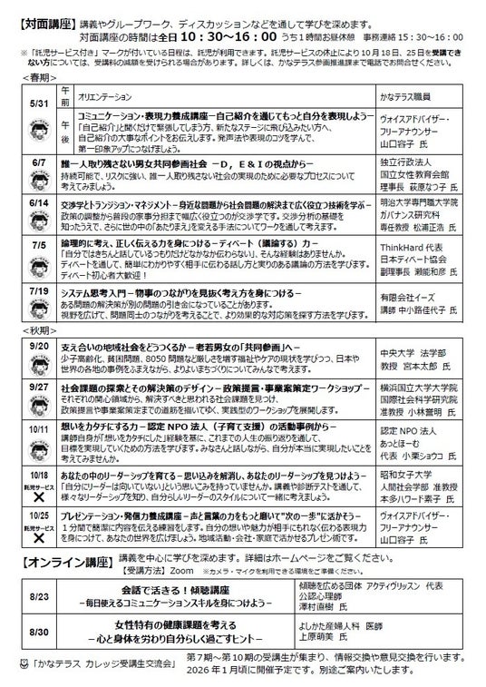 ※欠席される回があっても返金はできません。※託児サービスの休止により秋期の10月18日、25日を受講できない方については、受講料の減額を受けられる場合があります。詳しくは、かなテラス参画推進課まで電話でお問合せください。