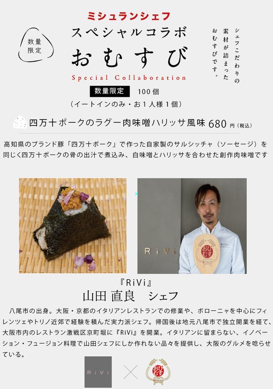 ミシュランシェフの手作りおむすび!第九弾は今年のミシュランガイドから掲載の話題店『RiVi』山田直良シェフとのコラボによるイノベーションおむすび4月11日より完全数量限定で提供開始