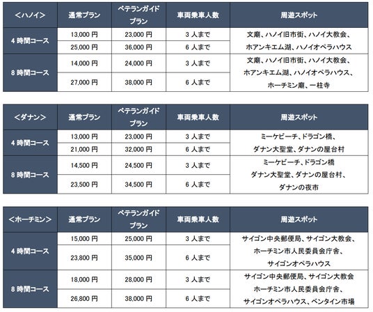 本プランは、チャーター車両を利用することで、旅行者の希望に応じた行程で安心して観光することが可能になり、より自由な旅をお楽しみいただけます。対応エリアは、人気のハノイ、ダナン、ホーチミンの3エリアです。