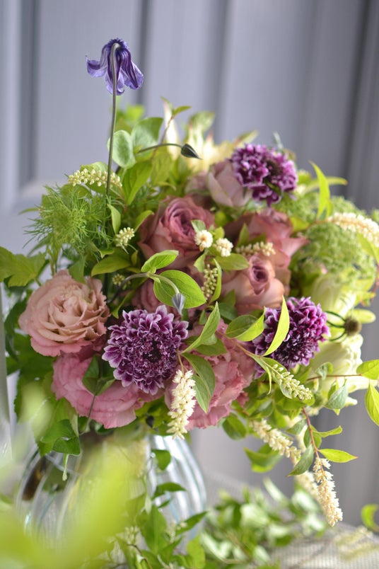 芳しい香りを纏う旬のバラや可憐な初夏の草花、爽やかなグリーンを束ねてナチュラルな雰囲気のブーケを作ります。日常から少し離れて、幸福感溢れる花の香りに包まれながら、瑞々しい植物に触れる癒しの時間をお過ごしください。