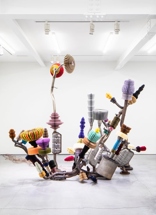 使い古された車のパーツなどの金属を、紙やフェルトで出来た繭上の物体と組み合わせる、 アッサンブラージュの手法を用いた作品を手掛ける宮崎啓太が、本展のために雲形池の《鶴の噴水》を囲むように、鳥の巣を思わせる彫像を制作します。