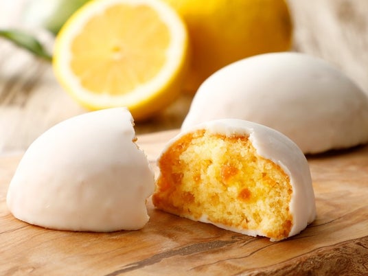 ▼レモンケーキレモンピール、蜂蜜を加え、しっとりと焼き上げたスポンジ生地を、レモン風味のホワイトチョコレートでコーティングしました。