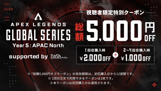 「世界中の人々が健康で豊かに生活できる未来を届ける。」をミッションに掲げ、手軽に美味しく栄養管理ができる冷凍宅配食サービス「nosh(ナッシュ)」を提供するナッシュ株式会社(本社:大阪市、代表取締役:田中 智也)は、国際的なeスポーツ大会「Apex Legends Global Series Year 5(以下ALGS)」へ協賛し、新規購入で総額5,000円OFF(※)となるお得なキャンペーンを実施いたします。