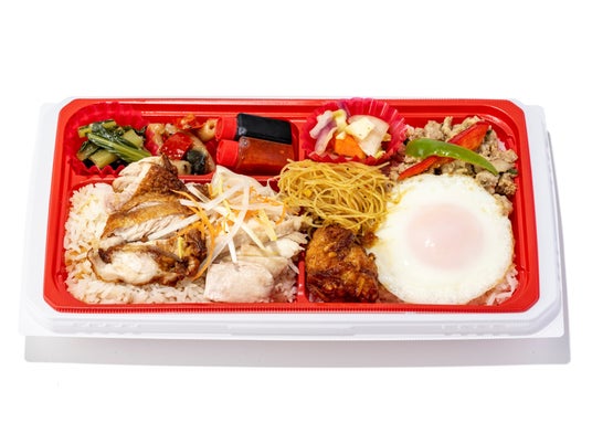 シンガポールチキンライスを代表とした東南アジア料理全般を提供する「ミスターチキン鶏飯店」。ミスターチキン1番人気の、蒸し鶏と揚げ鶏が入ったシンガポールチキンライス ミックスと、ガパオライスが一緒に入ったスペシャル弁当です。トムヤム味の唐揚げや、カレー味のビーフンも入って、いろいろなお味が楽しめるお弁当です。