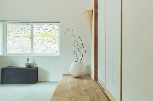 瀬戸内海に浮かぶ豊島はアートの島とも呼ばれ、国内外から日本の美意識やアートに関心のある方が多く訪れています。今回の「MUJI BASE TESHIMAII」は、豊島の高台にある「井奥条(いのくじょ)」の集落に残る空き家を活用し、良品計画が内装の企画・デザインを行いました。既存の天井を取り除いて梁を見せることで、天井高を確保し開放的な空間に仕上げ、和室は、敷居・鴨居・床柱などの伝統的な要素を残しつつ、麻畳を用いて清潔感のある雰囲気にしています。キッチンや洗面台、フローリングにはオリジナル製品を採用し、無印良品のベッドやキッチン家電などを取り入れ、無印良品の世界観とアートを融合した施設としました。