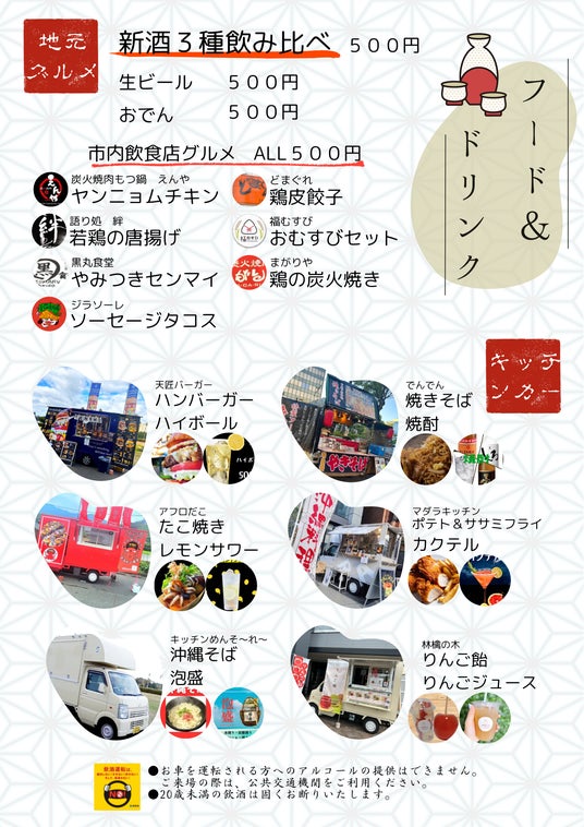 メニュー:新酒3種飲み比べ・生ビール・おでん・地元グルメ(ALL 500円)、キッチンカーフード