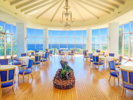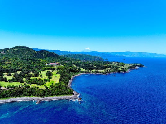 階段を登ると目の前に広がる360度の絶景。青い海に広い空。ゴルフコースも見渡すことができ、晴れた日には房総半島や富士山、伊豆七島を望むことができます。