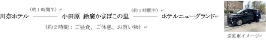 2:30P.M. JR伊東線伊東駅までお車でお迎え(場所:川奈ホテル シャトルバス乗り場/伊東駅改札出口より徒歩1分)