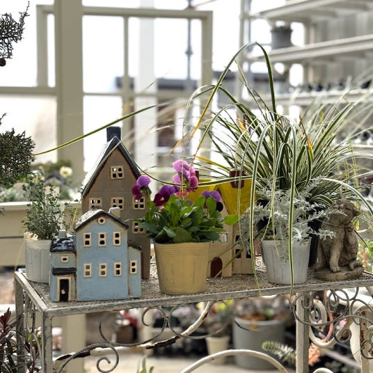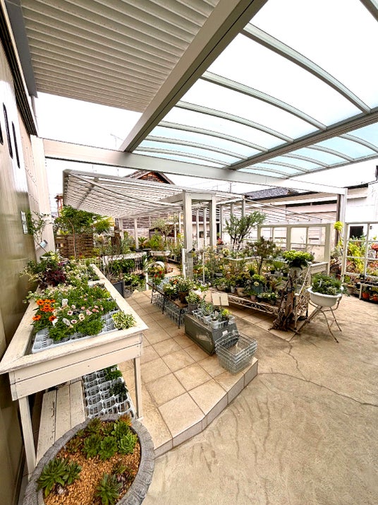 300坪の広々とした店内には、珍しい花苗やガーデン雑貨、インテリア雑貨など、暮らしを彩るアイテムが並びます。