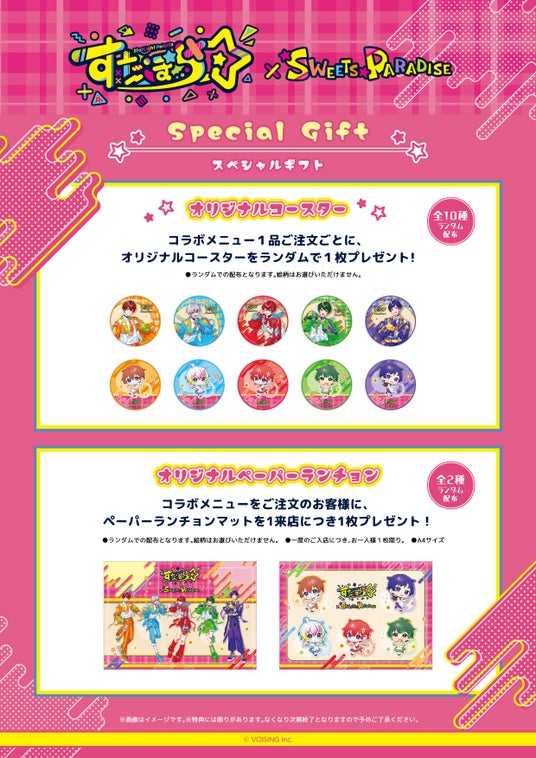 コラボメニューをご注文いただいたお客様全員に、1来店につきランダムでペーパーランチョンマットをプレゼント。ランチョンマットには、新ビジュアルになった「すたぽら」メンバーが描かれたデザインと、可愛らしいデフォルメイラストが描かれたデザインの2種類があり、食事の時間を特別なものにしてくれること間違いなし。