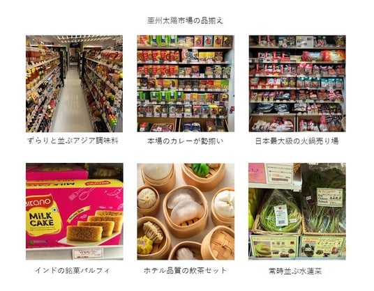 亜州太陽市場では、「本場の味を食卓へ」「他にはない、がきっと見つかる」を合言葉に事業展開し、アジア・太平洋州地域の 2000 以上のアジア⻘果、スパイス・ハーブ、調味料、フォーや春雨などの乾麺類、本場の小籠包や水餃子、サモサ、ファラフェルなどの冷凍食品、キムチ、豚足などの冷蔵食品、ココナッツや中国茶などの飲料、アジア食器、雑貨などをワンストップで提供しています。オープン以来、他店では見つけにくい本場のアジア商品を品揃えし続けることで、本場の味に拘る日本のお客さまから大きな支持を得てきました。また、自国ブランド、商品に慣れ親しんだアジアを中心とした外国籍のお客さまからも「漸く買えるところが見つかった」とご好評をいただいております。