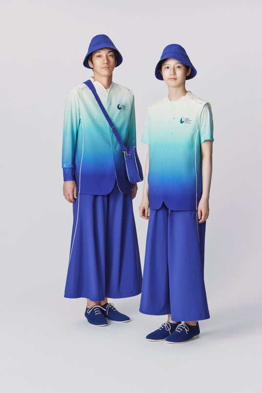 大阪ヘルスケアパビリオンのテーマ「REBORN」から着想を得て、パビリオンロゴのシンボルであるタマゴや大阪を象徴する水のイメージを、曲線的なラインやフォルムで表現しています。ユニフォームカラーもパビリオンロゴに合わせ、水や植物、自然との調和を表すグラデーションで彩っています。性別を問わず、会期を通して着用できるユニフォームとして、ベスト・長袖カットソー・半袖カットソーを気温等に合わせて自由に組み合わせることで着用者が柔軟に寒暖差に対応できるように考えました。