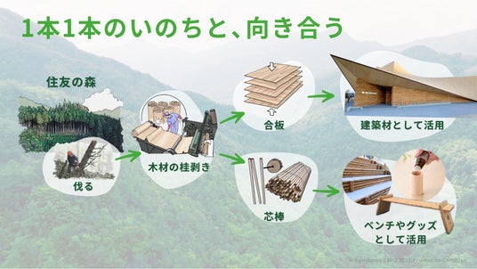 1970年の万博の時に植えられたスギやさらに樹齢を重ねたヒノキなど、住友館は約1000本の住友の森の木々を活用。数世紀にわたって人の手で育てられてきた森の木々を「1本1本のいのちを大切にする」考えのもと、木材を余す事なく使える「桂剥き」加工を採用。建築デザインでは住友グループの発展の礎である「四国別子の山々」をモチーフにしています。また、入口付近の外壁は年輪や地層を想起させる「時の積層」をイメージしています。