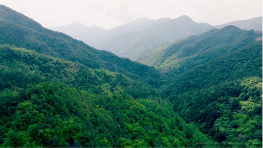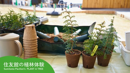 住友が数世紀にわたって大切にしてきた「住友の森」。先人たちが植えて、育てた、この森の木々でつくられた住友館で、未来の森づくりへ参加いただける「植林体験」を実施。森林と人の関係や森林循環の重要性を学びながら、苗木や土に触れる体験をしていただきます。体験を通して、森や自然と向き合い、未来へ想いを馳せつづけるきっかけを提供します。万博期間中に用意した約1万本の苗木は、住友館の建築の為に伐採した跡地を含めた「住友の森」に植えられ、数十年後、数百年後の未来へと継承されていきます。