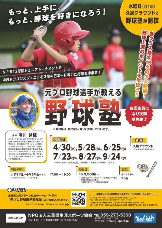 特定非営利活動法人三重県生涯スポーツ協会(三重県津市、理事長 竹田昌平)は、津市の久居グラウンド(津市久居西鷹跡町2)にて、湊川誠隆氏を講師に招き、「元プロ野球選手が教える野球塾」を開催します。本事業は、昨年に続き2年目であり、4月~9月までの開催日が決定しましたのでお知らせします。