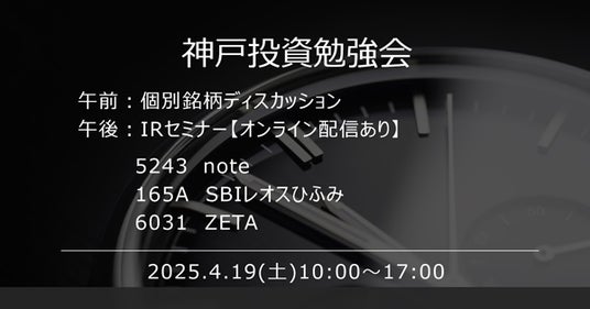 2025年4月19日(土)に神戸で開催される個人投資家向けIRセミナー「神戸投資勉強会」に代表取締役社長の山崎が登壇し、ZETAのIR情報を読み解く上でのポイントについて詳しく解説いたします。