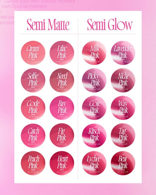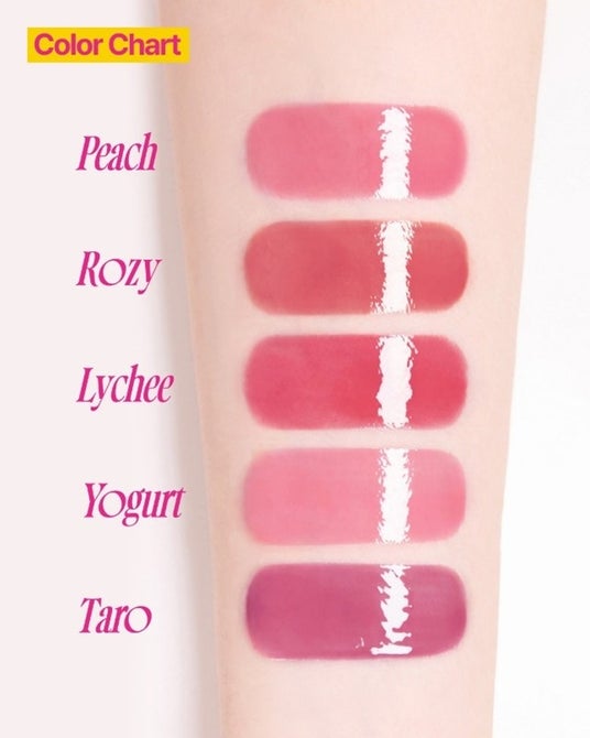 Qoo10総合ランキング1位、オリーブヤング全体ランキング1位(韓国内)を獲得した話題の新色、シュガーシロップのようなツヤのより甘い濃度70%のピーチ、ロージー、ライチ、ヨーグルト、タロの5色が仲間入りし、全17色の豊富なカラーバリエーション。