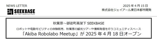 「未知のワクワクとスグレモノを探すことができる」をコンセプトとした、JR秋葉原駅と御徒町駅間高架下の商業施設『SEEKBASE AKI-OKA MANUFACTURE (シークベース アキオカ マニュファクチュア)』(以降、「SEEKBASE」)内に、ロボットやEVの体験販売、秋葉原のツアーや情報発信の場「Akiba Robolabo Meetup」が2025年4月18日(金)にオープンいたします。