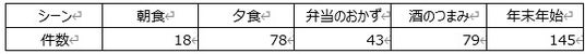 ・年末年始(145件)酒のつまみ(79件)夕食の一品(78件)弁当のおかず(43件)など、多様な生活シーンに登場