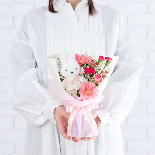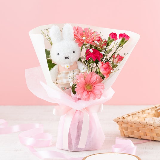 ほわほわマスコットと生花の組み合わせがかわいい、花瓶なしで飾ることが可能なスタンディングブーケです。ピンクとイエローの2色展開でそれぞれのお花のカラーに合わせたお洋服を着ているマスコットのミッフィーが、花々の間からちょこんと顔をのぞかせます。