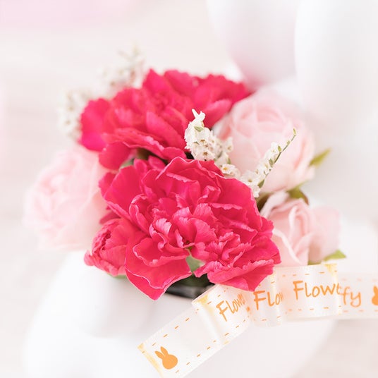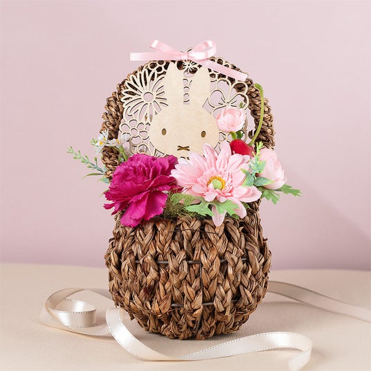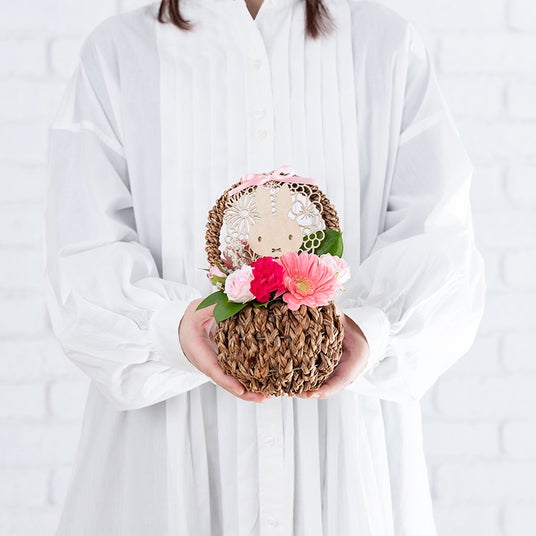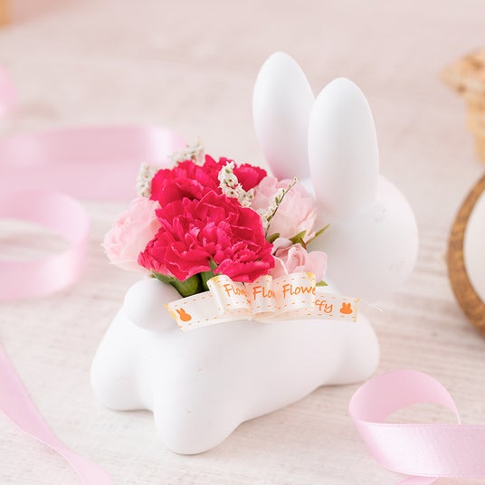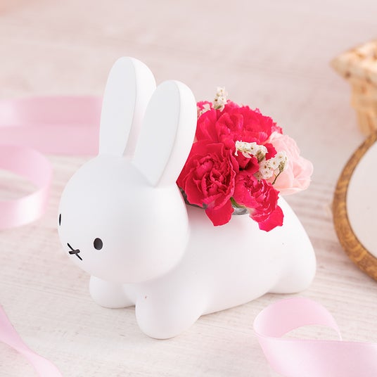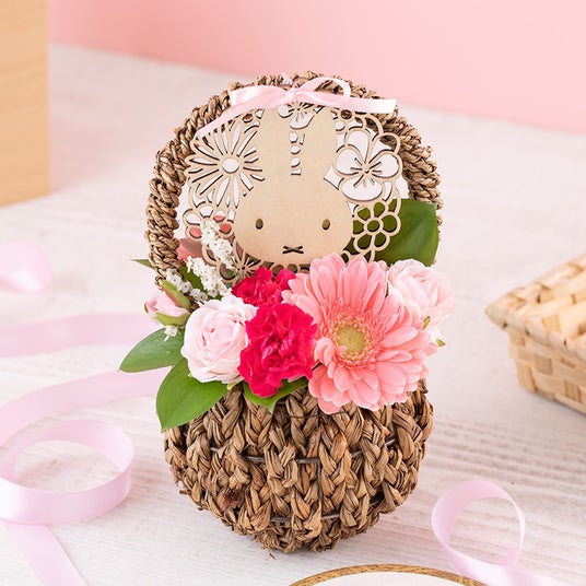 お花を楽しんだあとは小物入れとしても使える、プランターカバーのうさぎが背中にお花を乗せているかのような、生花のフラワーアレンジメントです。場所を選ばず置ける小さめサイズで、フラワーミッフィーのロゴの入ったリボンがあしらわれています。