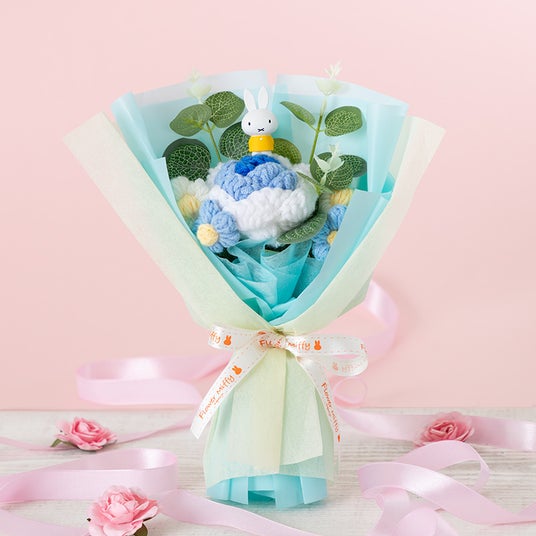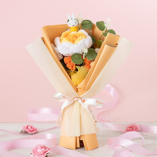 ニット素材のお花とミッフィーのピックのブーケです。ニットならではのあたたかみと、ほっこりとしたかわいらしさを感じられます。
