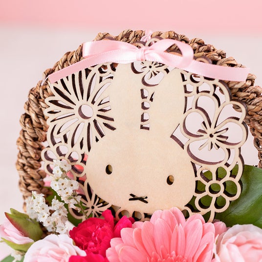 ディック・ブルーナさんが描いたお花をデザインしたミッフィーの木製コースターが付属した、生花のフラワーアレンジメントです。お花を楽しんだあとは、コースターとしてご使用いただけます。