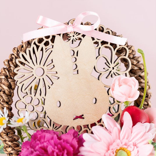 ナチュラルなミッフィーデザインの木製コースターが付属した、アートフラワーアレンジメントです。アートフラワーを使用しているのでお手入れが不要で、お部屋に置くだけで木のぬくもりを感じられます。