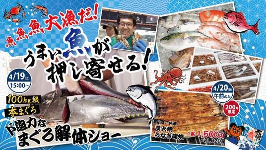 魚魚魚!綿半魚類一宮漁港平島店1周年祭特別企画 4/19は超ド級!100kg級「本まぐろ解体ショー」 過去最大サイズの本マグロを解体!即売します!4/20はうなぎの炭火焼を 200 匹限定販売します!