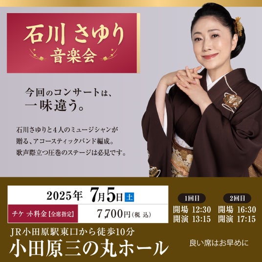 「石川さゆり 音楽会」小田原三の丸ホールで開催! 今回のコンサートは、一味違う。石川さゆりと4人のミュージシャンが贈る、アコースティックバンド編成。歌声際立つ圧巻のステージは必見です。