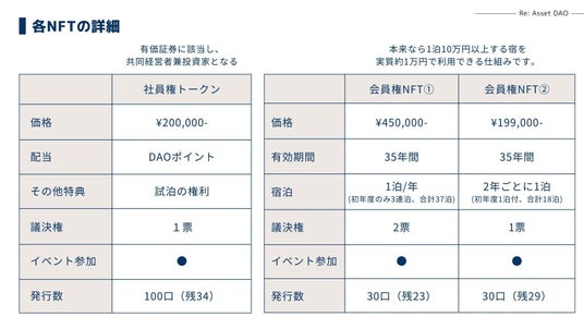 「Re: Asset DAO」は、第一号ファンドとなる「囲み宿 こわね」プロジェクトへの出資を募集しています。投資方法は以下の3種類となっています。