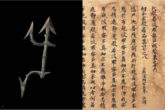 (左)三鈷杵 奈良時代または中国・唐(8世紀)/(右)大般若経 巻第九十六(魚養経)奈良時代(8世紀)