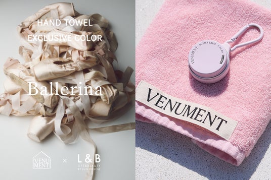 昨年「Life&Beauty by JUN ONLINE」での取り扱いを皮切りに日本上陸を果たした、韓国発ライフスタイルビューティーブランドとのコラボレーションが実現。日本上陸時から好評のハンドタオルから、別注カラーのピンクが登場します。柔らかい色合いは、ブランドを象徴するプロダクト「BUTTER BALM」のBALLERINAカラーからインスパイアされたもの。フックにかけて使用できるロゴプリントのラベルもポイントです。