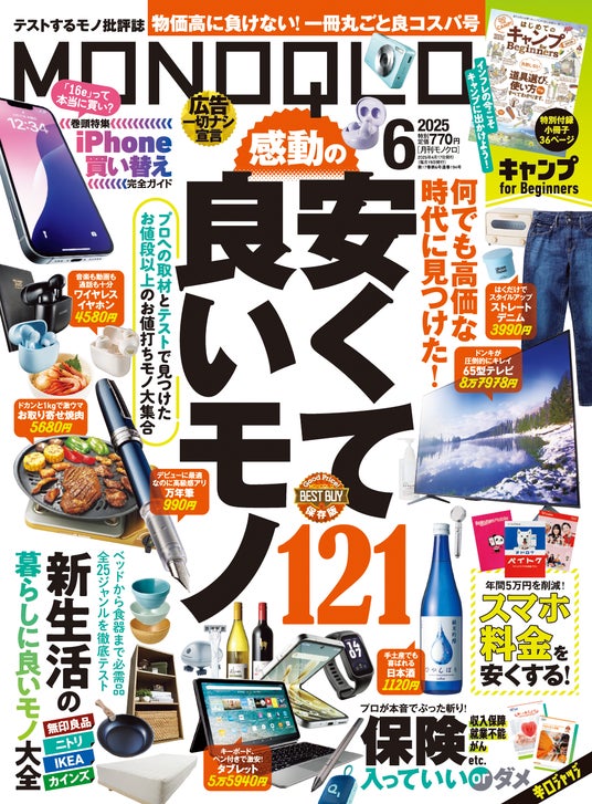 6月号は「安くて良いモノ the BEST 121」を総力特集! 何でも高価な時代に見つけた感動の選りすぐりを大放出しちゃいます。 他にも、今春の「iPhone買い替え完全ガイド」や人気ショップの「新生活暮らしの良いモノ大全」、「入っていい&ダメな保険 辛口ジャッジ」も掲載! 6月号も暮らしをアップデートする情報を厳選してお届けします。