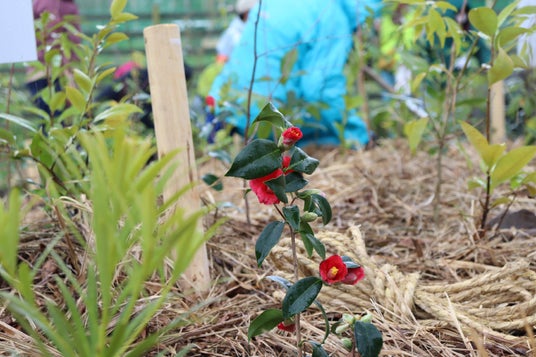 樹を植えたあとは、ワラでマルチングを行い、さらにワラが飛ばないよう縄をかけます